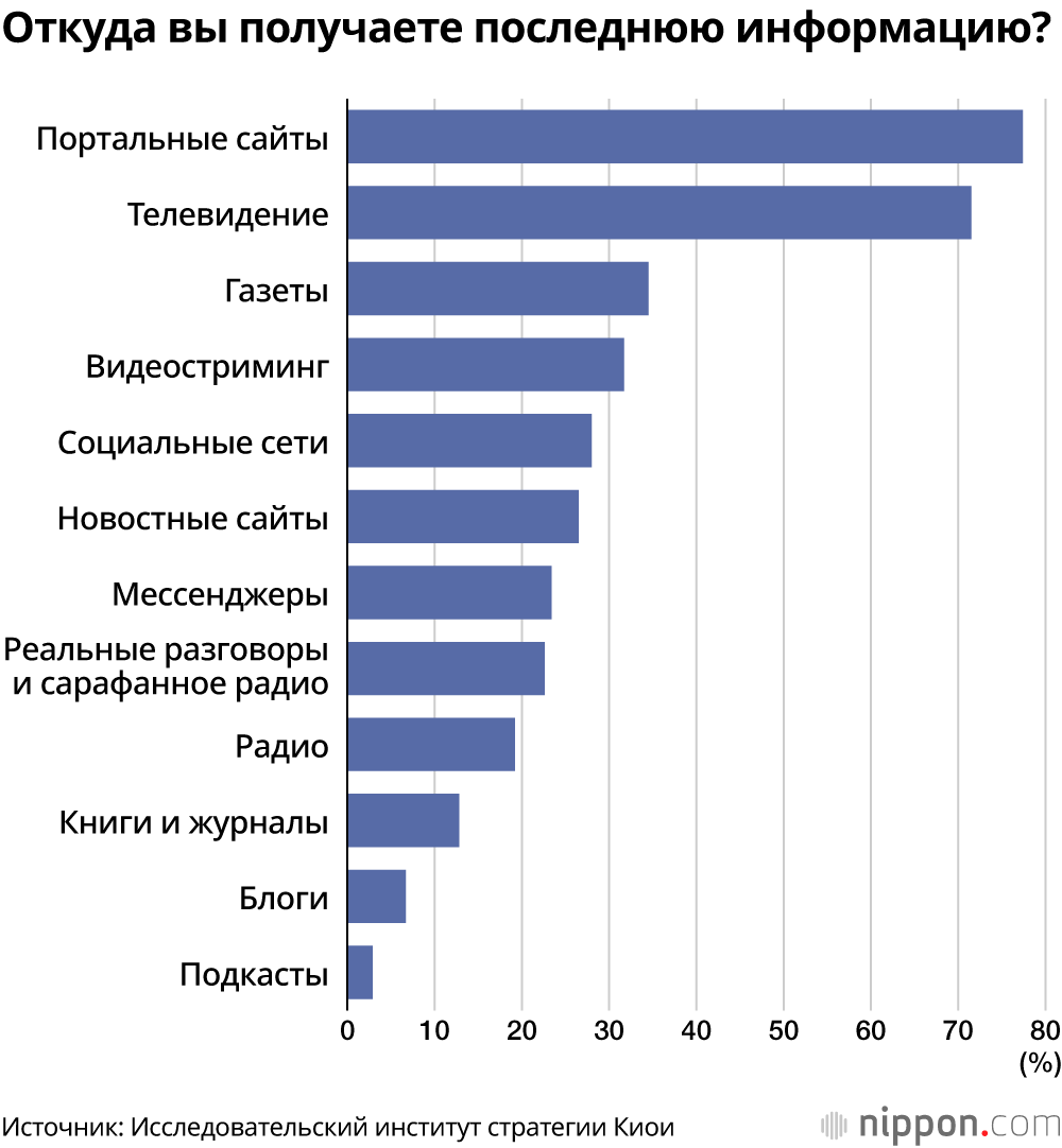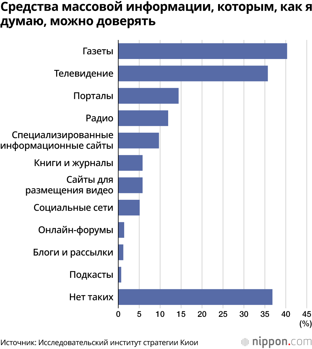 В ходе онлайн-опроса, проведенного Исследовательским институтом стратегии Киои (район Минато, Токио) среди 1000 совершеннолетних респондентов, на вопрос «Каким СМИ вы доверяете?» (с возможностью множественного выбора) с большим отрывом лидировали традиционные медиа: газеты — 40,3% и телевидение — 35,7%. Уровень доверия к набирающим влияние видеохостингам (5,8%) и социальным сетям (5,1%) оказался значительно ниже.