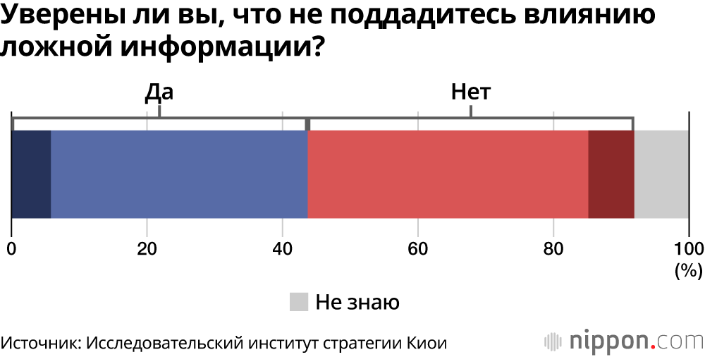 На вопрос «Уверены ли вы, что не поддадитесь на ложную или недостоверную информацию», в общей сложности 43,7% ответили «Уверен» или «В некоторой степени уверен», в то время как 48,2% ответили «Не очень уверен» или «Не уверен».