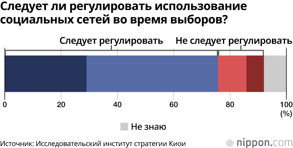 После выборов губернатора префектуры Хёго, проведенных в 2024 году, возникла дискуссия о надлежащем использовании социальных сетей во время выборов, поскольку поступали сообщения о распространении через социальные сети непроверенной информации и клеветы о кандидатах. На вопрос «Считаете ли вы, что использование социальных сетей во время выборов должно регулироваться?» в общей сложности 75,7% ответили «Должно регулироваться» или «В определенной степени должно регулироваться». По возрастным группам наблюдалась тенденция к увеличению доли таких ответов с возрастом.