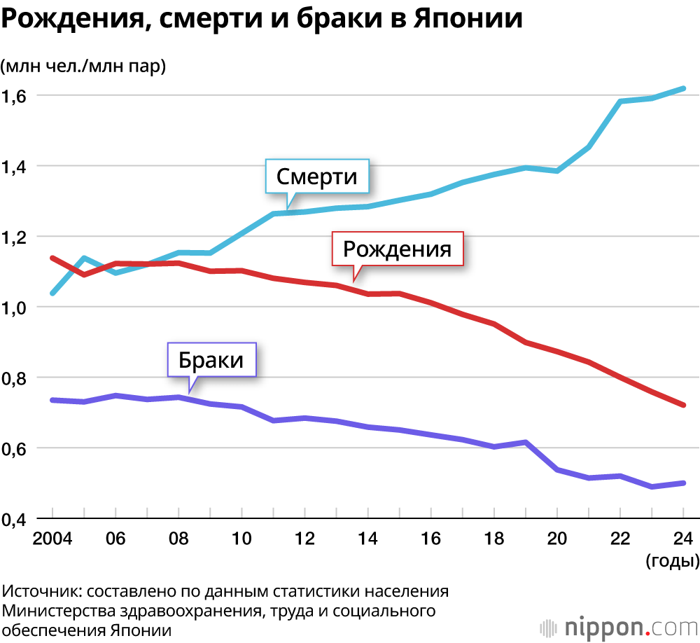Число браков в 2024 году составило 499 999, что на 10 718 больше, чем в предыдущем году, но остаётся на довольно низком уровне. В Японии по-прежнему стремятся избегать добрачной и внебрачной беременности, и пока количество браков остаётся на прежнем уровне, трудно ожидать роста числа рождений.
