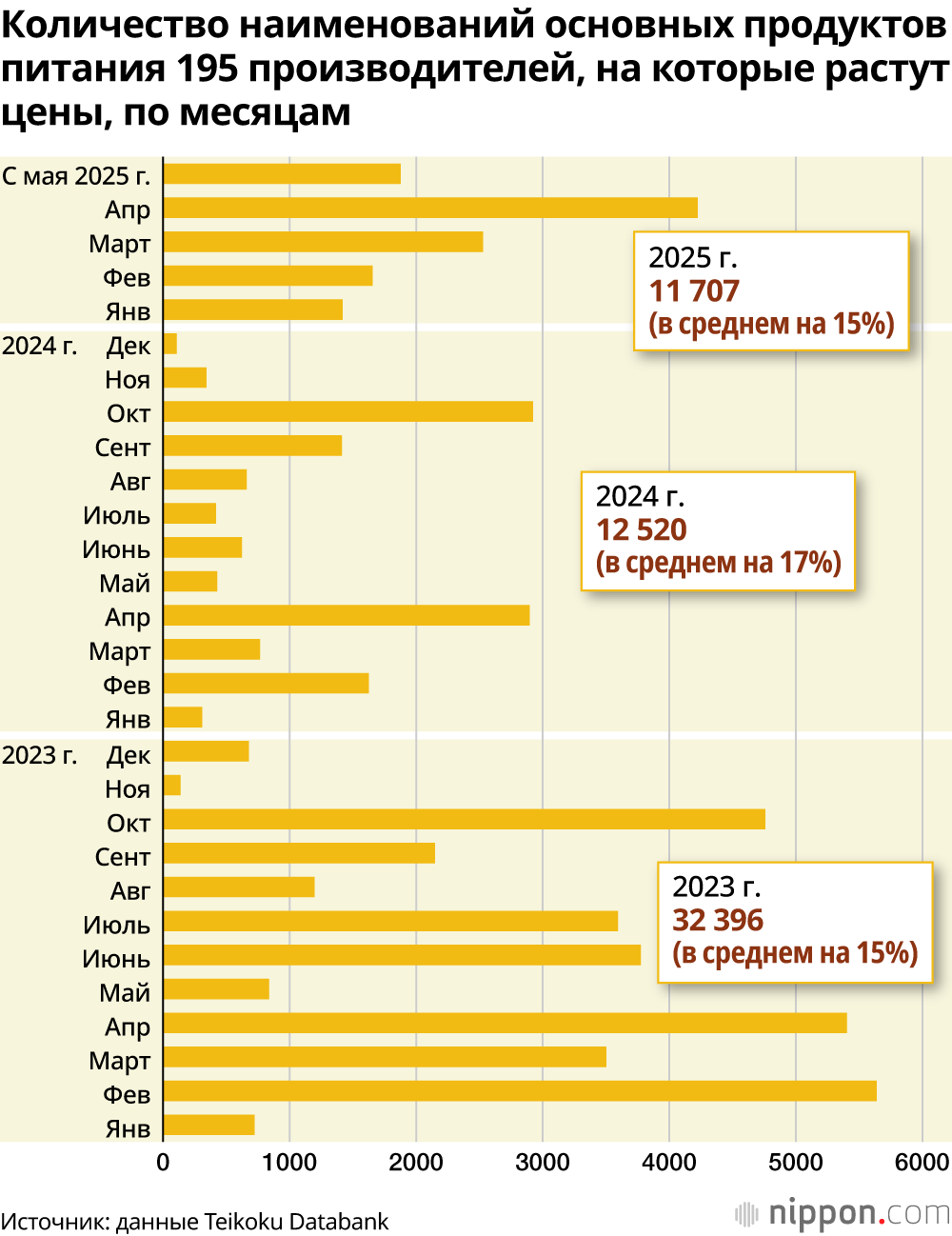 По прогнозам Teikoku Databank, «количество продуктов питания, цены на которые вырастут в 2025 году, уже в апреле превысит показатели предыдущего года, а общее количество за год может достичь около 20 000 наименований».
