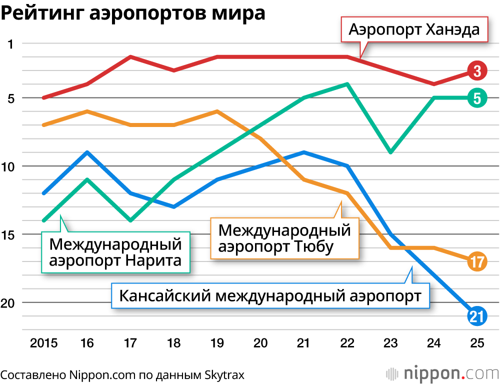 В общем рейтинге Skytrax World Airport Awards 2025 Международный аэропорт Токио (аэропорт Ханэда) занял третье место, поднявшись на одну позицию по сравнению с предыдущим годом. Ранее он занимал второе место с 2019 по 2022 год, опустившись на третье место в 2023 году. Международный аэропорт Нарита второй год подряд остаётся на пятом месте.