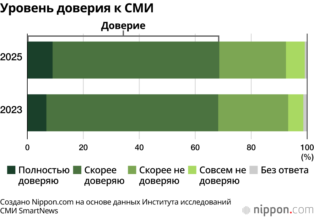 Общенациональное исследование Института исследований СМИ SmartNews показало, что 68,7% респондентов «скорее» или «полностью» доверяют СМИ – телевидению, газетам и радио. Уровень доверия не изменился с момента предыдущего опроса 2023 года.