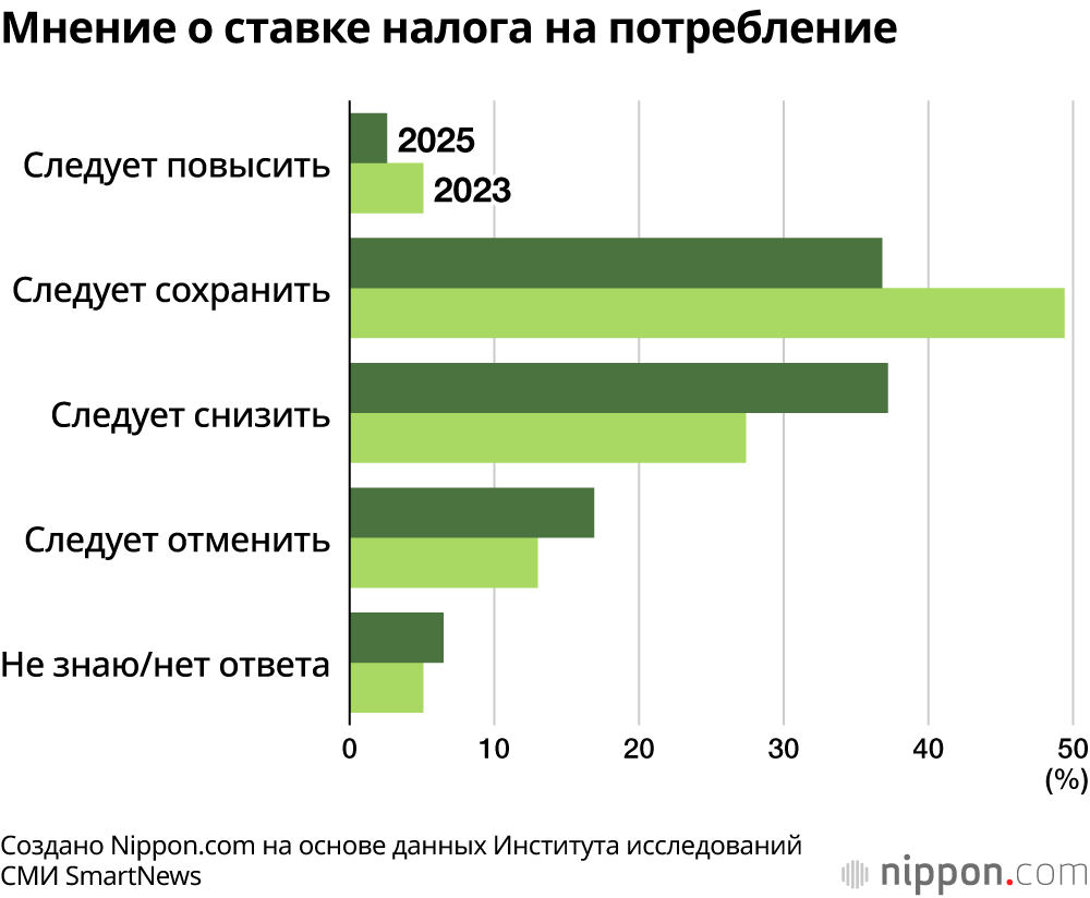 Налог на потребление в Японии стал главной проблемой накануне предстоящих выборов в Палату советников, которые должны состояться этим летом. В опросе 2023 года 54,5% респондентов выступали за сохранение или повышение налога. Однако результаты опроса 2025 года показывают, что уровень поддержки этих вариантов упал до 39,4%, в то время как 54,1% хотели бы снижения или отмены налога на потребление. По возрастным группам люди в возрасте тридцати лет показали самый высокий уровень поддержки снижения или отмены налога – 60,2%.