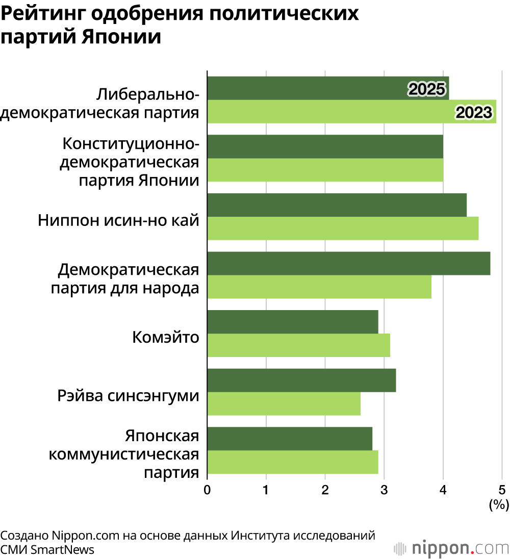 Участников опроса также попросили оценить своё отношение к каждой политической партии по 11-балльной шкале от 0 (решительно против) до 10 (решительно поддерживаю). По сравнению с опросом 2023 года рейтинг одобрения ЛДП снизился на 0,8 балла. Наибольший рост одобрения показали Демократическая партия для народа (плюс 1,0 балл) и Рэйва (плюс 0,6 балла).