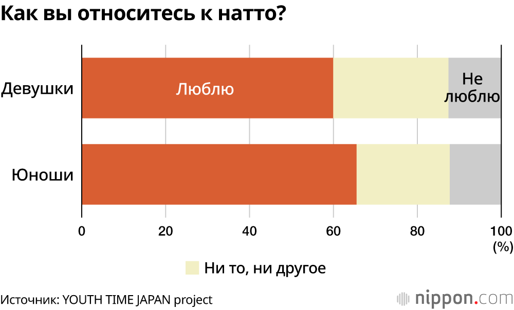 В ходе опроса 59,9% девушек и 65,5% юношей ответили, что любят натто – похоже, что этот продукт пользуется несколько большей популярностью у мужской части населения.