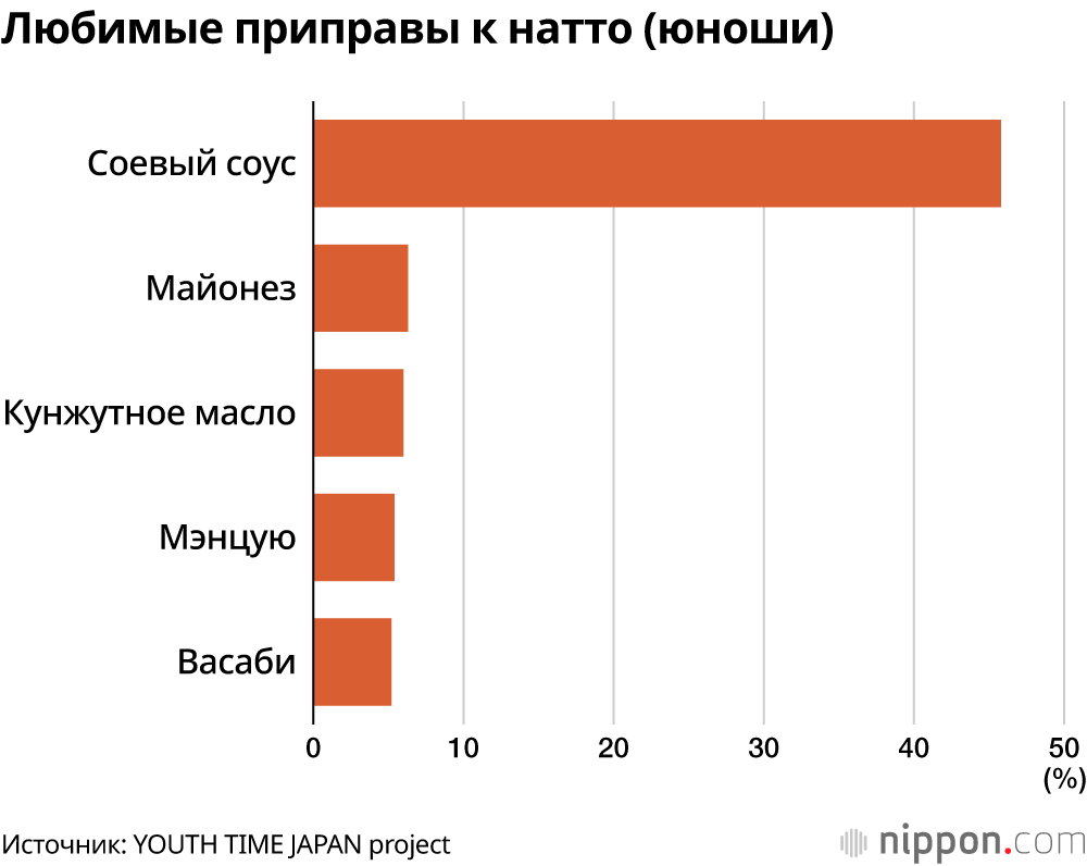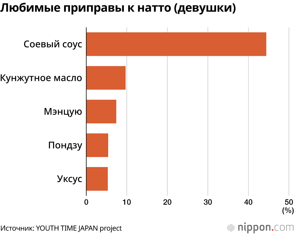 В качестве приправы к натто, которая им больше всего нравится (помимо соуса и горчицы, которые продаются в комплекте с натто), и девушки, и юноши часто называли соевый соус (около 45%), а в качестве топпинга чаще всего выбирали зелёный лук.