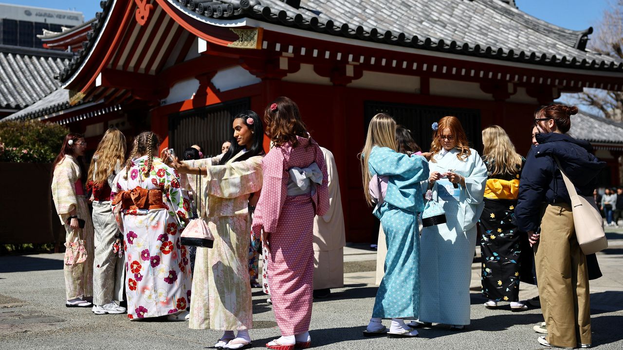 Фотография к заголовку: Иностранные туристы, посещающие Японию, позируют для памятных фотографий в кимоно (© Reuters)