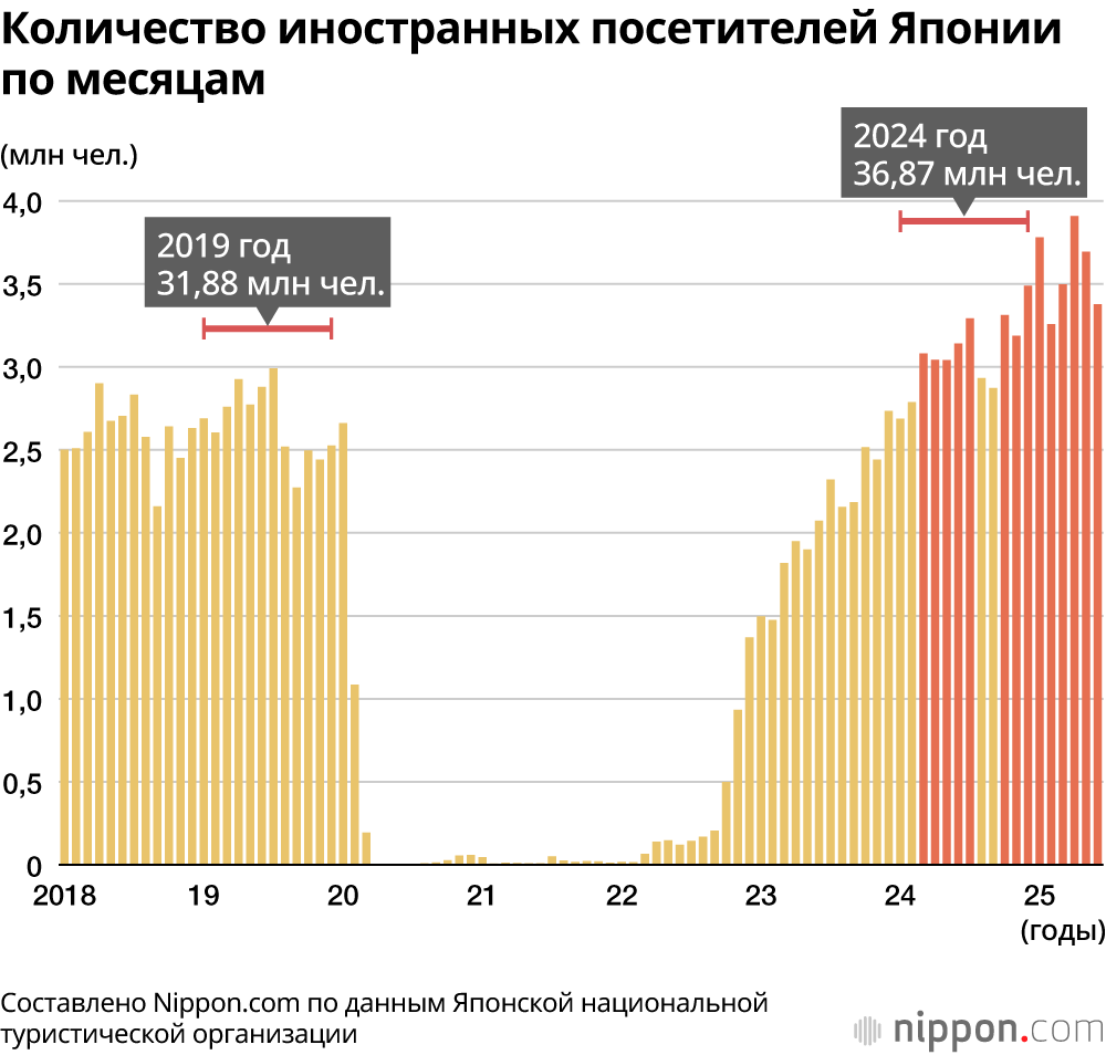 - Японская национальная туристическая организация Количество иностранных туристов, посетивших Японию (оценочное значение по состоянию на июнь 2025 г.)