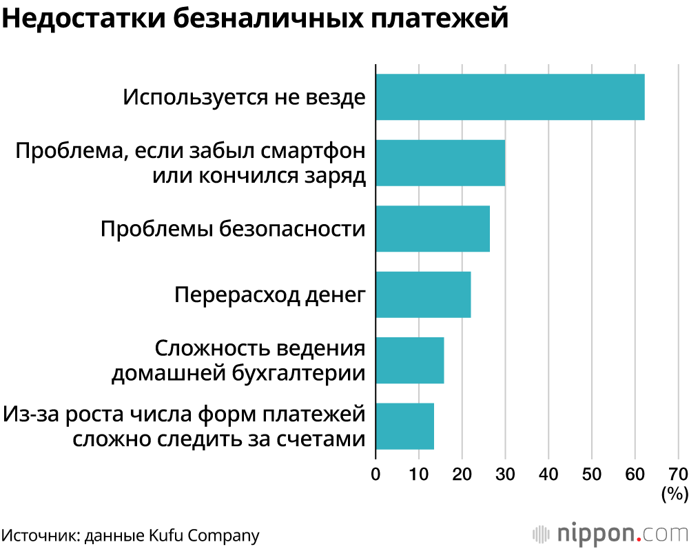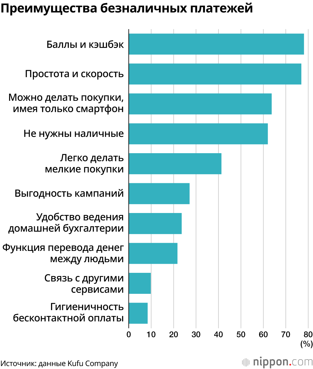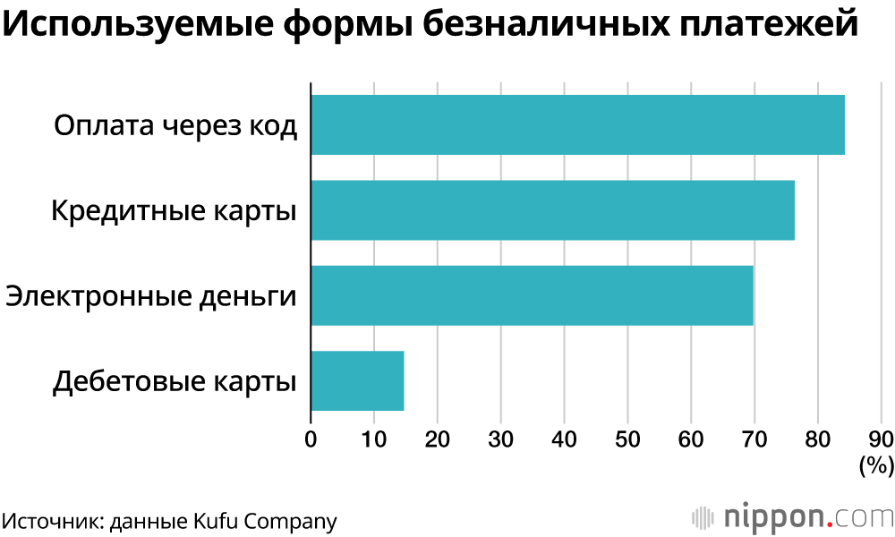 Платежи с использованием кодов стали стандартом безналичных платежей, превзойдя показатель в 76,3% для кредитных карт, появившихся в 1960-х годах и имеющих более чем полувековую историю. Доля «электронных денег» в сфере транспорта и розничной торговли составляет 69,8%. Дебетовые карты составляют меньшинство – 14,7%.