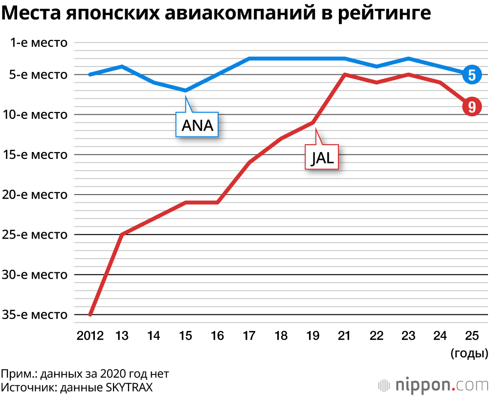 Рейтинг 2025 года охватывает более 325 авиакомпаний по всему миру. ANA опустилась на одну позицию с четвёртого места в прошлом году. Japan Airlines опустилась на три позиции с шестого места.