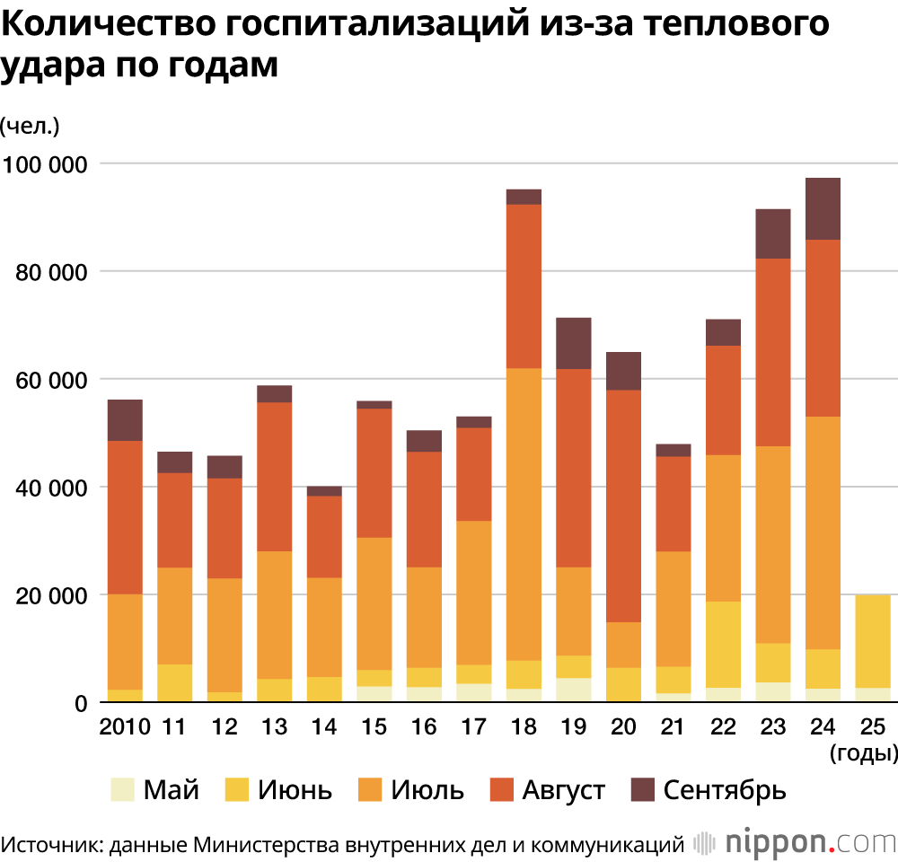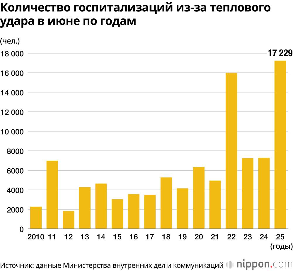 Агентство по борьбе со пожарами и стихийными бедствиями Министерства внутренних дел и коммуникаций сообщило, что в июне по всей стране 17 229 человек были доставлены в больницы с тепловым ударом. Это более чем вдвое превышает показатель 2024 года (7275 человек) и является вторым самым высоким показателем с начала ведения статистики, больше таких случаев было только в июне 2010 года. Предполагается, что такое количество госпитализаций связана с чередой чрезвычайно жарких дней с максимальной температурой выше 35 градусов Цельсия в различных регионах. При анализе по возрастным группам выяснили, что 60% от общего числа пострадавших составили 10 342 человека в возрасте 65 лет и старше.