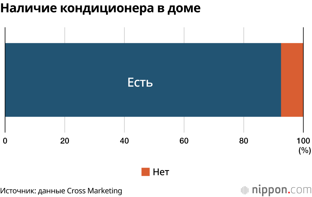Маркетинговая исследовательская компания Cross Marketing из токийского района Синдзюку провела опрос об использовании кондиционеров, получив 1100 релевантных ответов. Он охватывал жителей страны в возрасте от 20 до 69 лет, и показал, что в 92,5% домохозяйств есть кондиционеры. Из тех, у кого они есть, только 38,1% всегда выключают кондиционер, выходя на улицу в летнее время.