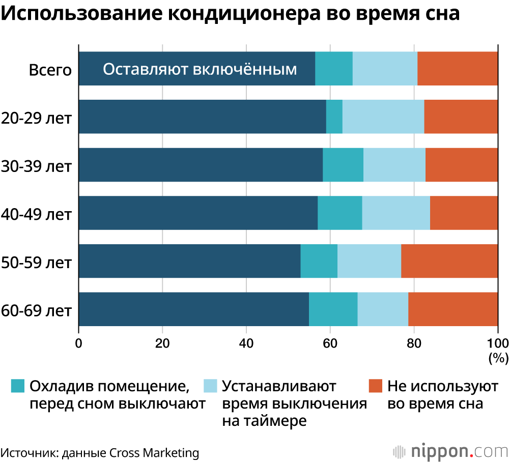 Что касается использования кондиционеров во время сна, то средний показатель тех, кто оставлял их включёнными на всю ночь, составил 56,4%. Этот показатель составляет более 50% для всех возрастных групп, и выше среди более молодых людей – при работающем кондиционере спит 59,0% в возрасте 20-29 лет и 58,2% в возрасте 30-39 лет. В связи с тем, что на протяжении уже ряда лет летом наблюдается «катастрофическая жара», привычка охлаждать комнату даже когда на время выходят на улицу, а также во время сна всё более укореняется.