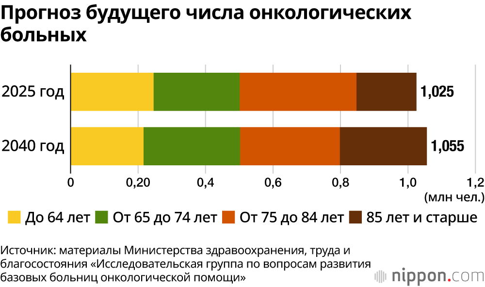 По прогнозам, количество впервые диагностированных случаев рака, которое в настоящее время составляет 1,025 миллиона человек, к 2040 году увеличится на 3% до 1,055 миллиона, а затем начнёт постепенно снижаться на фоне уменьшения населения из-за старения общества.