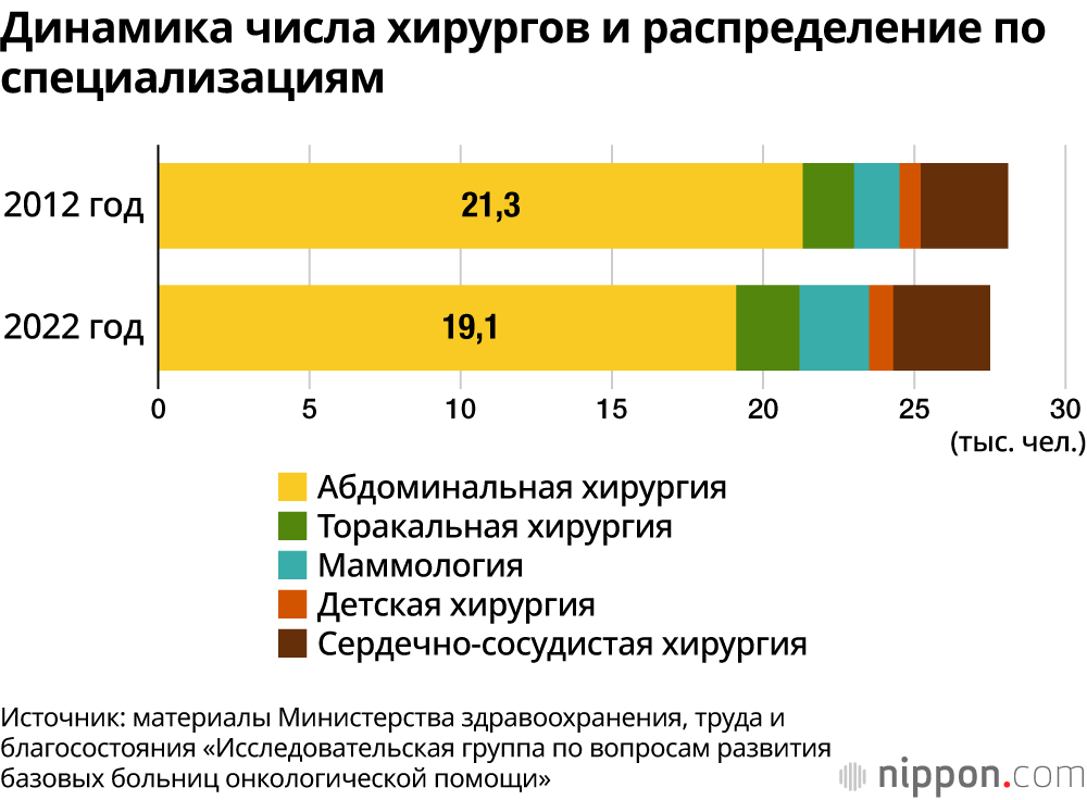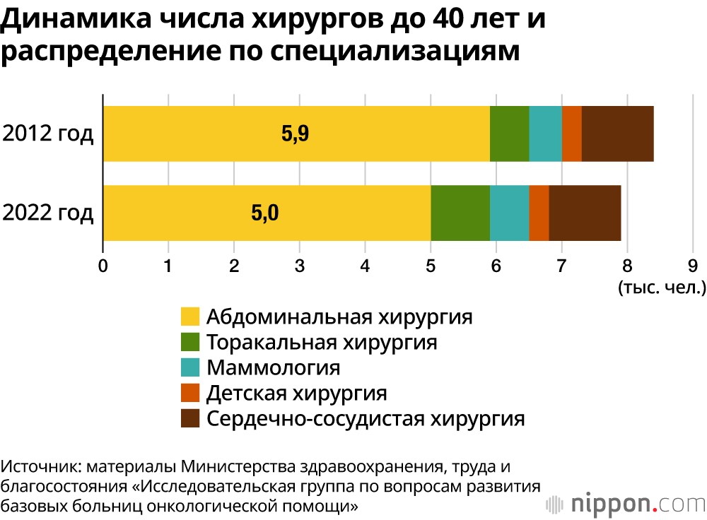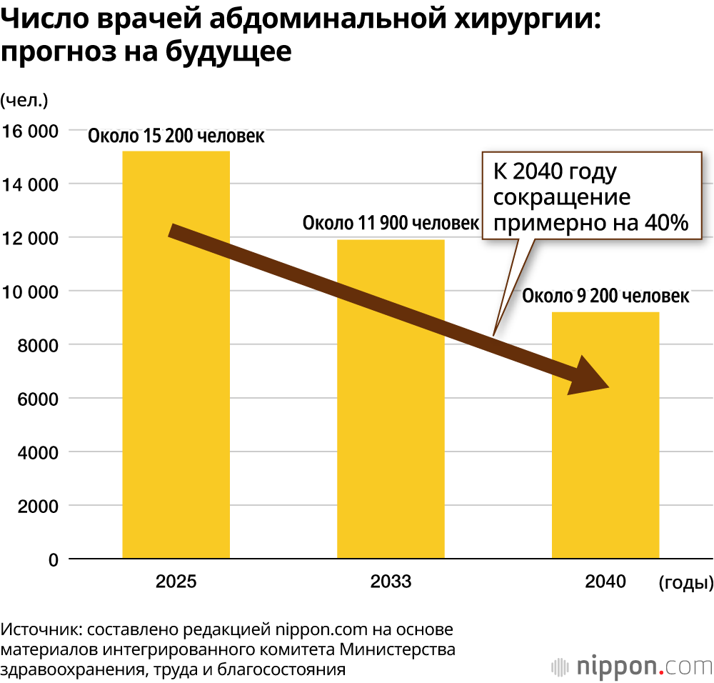 По расчётам экспертной группы, при сохранении текущей ситуации число врачей Японского общества абдоминальной хирургии (младше 65 лет) сократится с 15 200 человек в 2025 году до 9 200 в 2040 году — то есть на 39%.