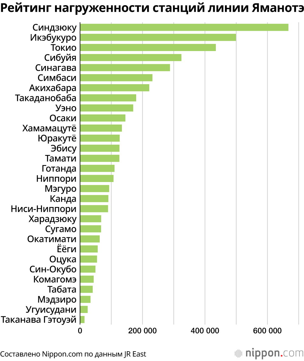 Из 30 станций центральной линии Яманотэ в Токио 26 вошли в сотню лучших от Синдзюку до Комагомэ, которая заняла девяносто восьмое место с 43 540 пассажирами. Станции Яманотэ, не вошедшие в первую сотню, — это Табата, Медзиро, Угуисудани и Таканава Гейтвей. На Угуисудани было в 27 раз меньше пассажиров, чем на Синдзюку, — всего 24 460. Наименьшее количество пассажиров было на станции Таканава Гейтвей, самой новой станции кольцевой линии, — 14 209. Однако, поскольку станция открылась только в 2020 году, ожидается, что её пассажиропоток будет расти по мере развития прилегающих районов.