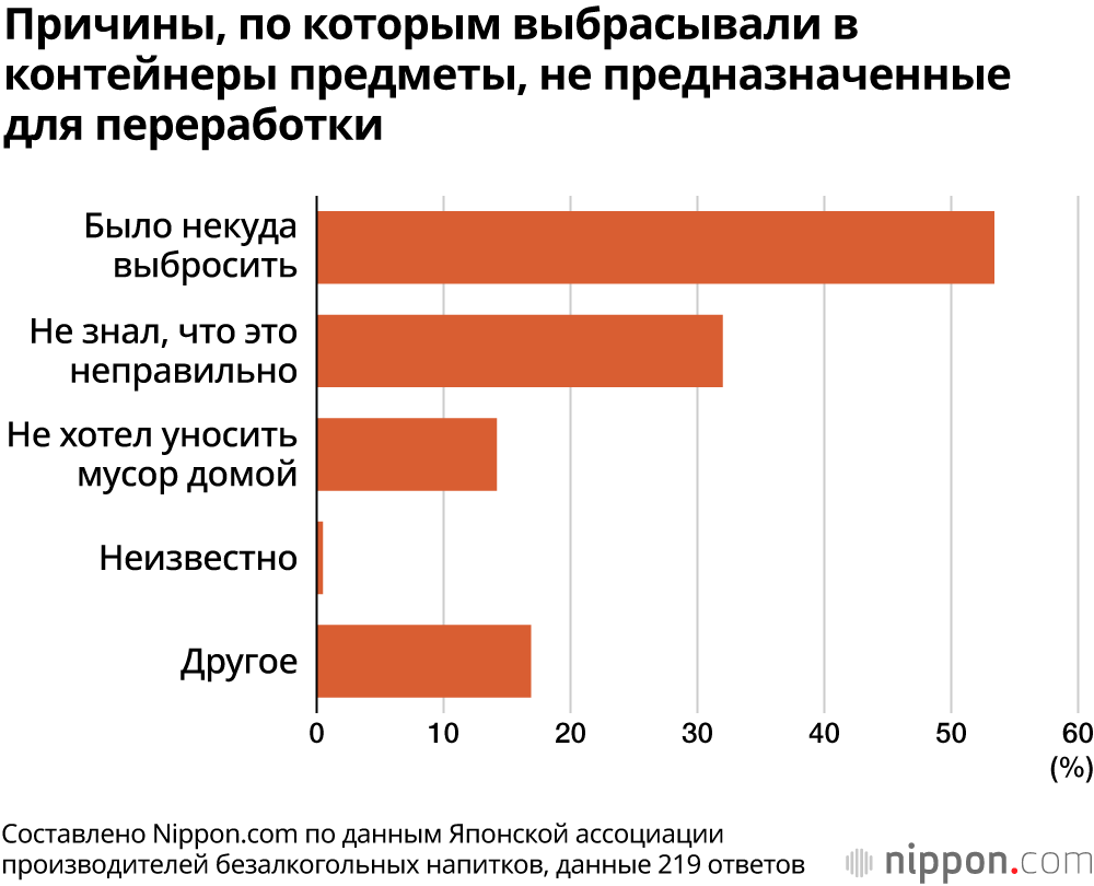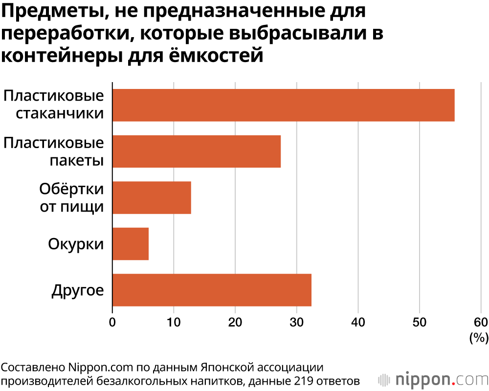 Чаще всего в эти баки выбрасывали не предназначенные для них пластиковые стаканчики (55,7%), за ними следовали пластиковые пакеты и обёртки от закусок. 53,4% ответили, что больше некуда было выбросить, а 14,2% сказали, что не хотели забирать мусор домой. Похоже, во многих случаях это делалось необдуманно. Ещё 32,0% заявили, что не знали, что это неправильно.