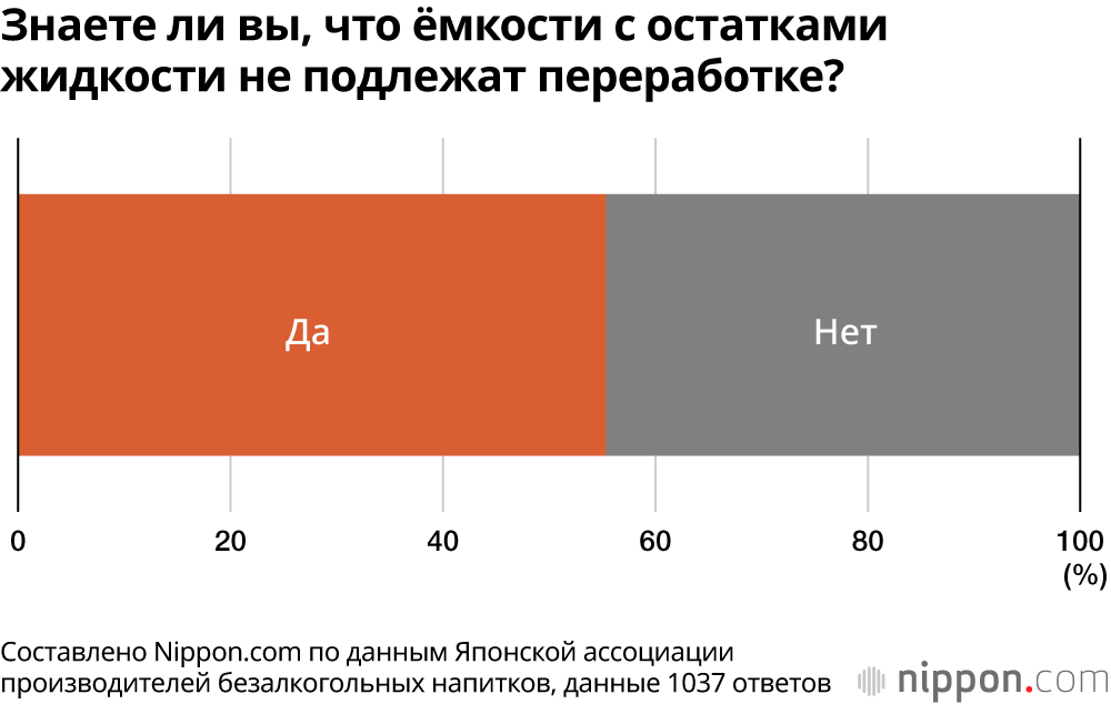 В общенациональном опросе, проведенном в начале сентября 2025 года Японской ассоциацией производителей безалкогольных напитков, респондентам в возрасте от 15 до 69 лет задали вопросы об их осведомлённости относительно переработки пластиковых бутылок и другой тары из-под безалкогольных напитков. Было получено 1037 достоверных ответов.
