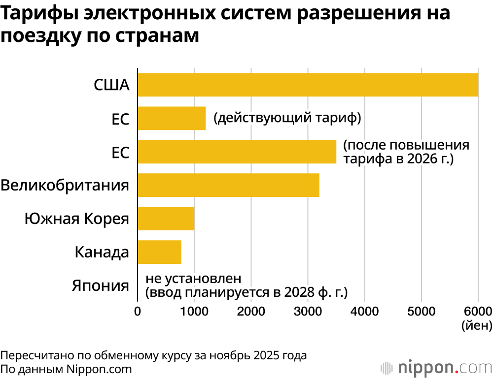 Страны Европы и США уже широко используют электронные системы разрешения на поездку для граждан государств и регионов, освобождённых от краткосрочных виз. Япония введёт такую систему с 2028 финансового года. От въезжающих в Японию будет требоваться предварительная онлайн-подача данных для прохождения пограничного контроля. На диаграмме ниже приведены сборы, установленные различными странами. Япония, вероятно, определит размер платы, ориентируясь на уровни, действующие в Европе и США.