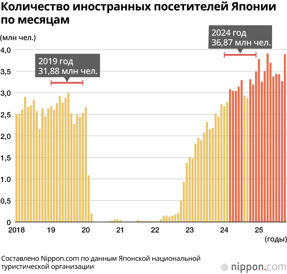 В 2025 году число иностранных туристов, посетивших Японию в октябре, достигло рекордного для этого месяца уровня в 3,89 миллиона человек