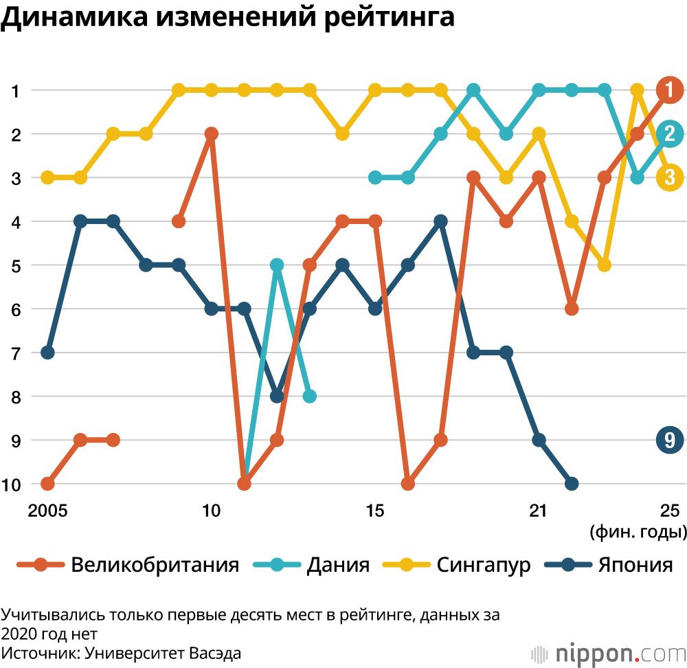Великобритания, занявшая первое место, получила высокую оценку за сохранение статуса «страны, основанной на науке и технологиях», а также за реализацию цифровой политики, учитывающей инклюзивность и устойчивость общества в целом. Финляндия, занявшая 10-е место, значительно поднялась с 17-го места в прошлом году. Становится очевидным превосходство в этом отношении стран с небольшим населением, таких как Дания, Сингапур и Эстония.