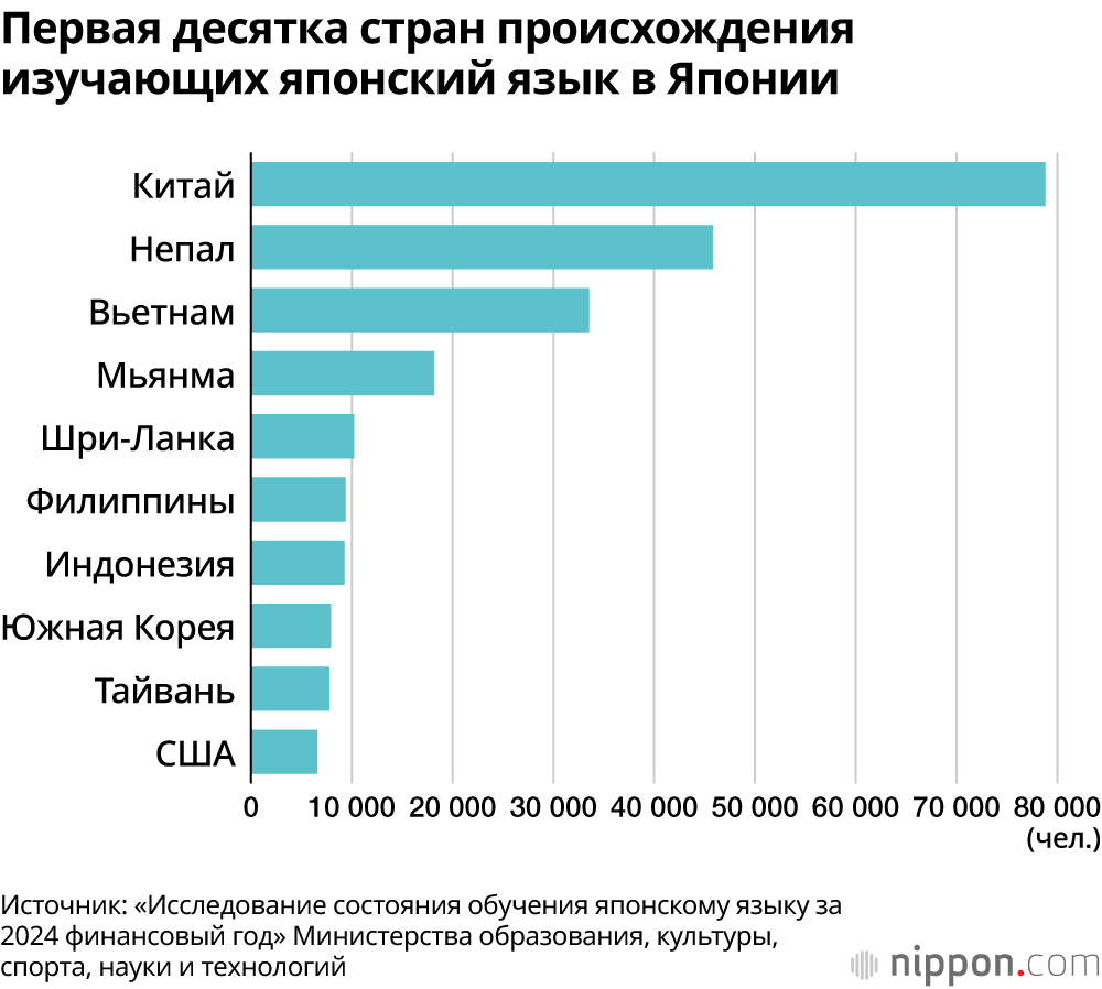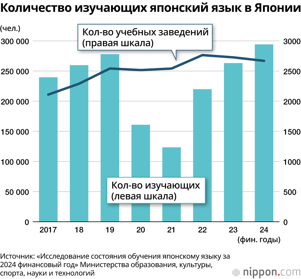 В исследовании 2024 года «Обзор текущего состояния преподавания японского языка» приняли участие университеты, в которых обучаются иностранные студенты, языковые школы, аккредитованные Министерством юстиции, а также курсы японского языка, проводимые местными органами власти и частными компаниями. Число учреждений и организаций, предлагающих обучение японскому языку, достигло 2669 по всей стране.