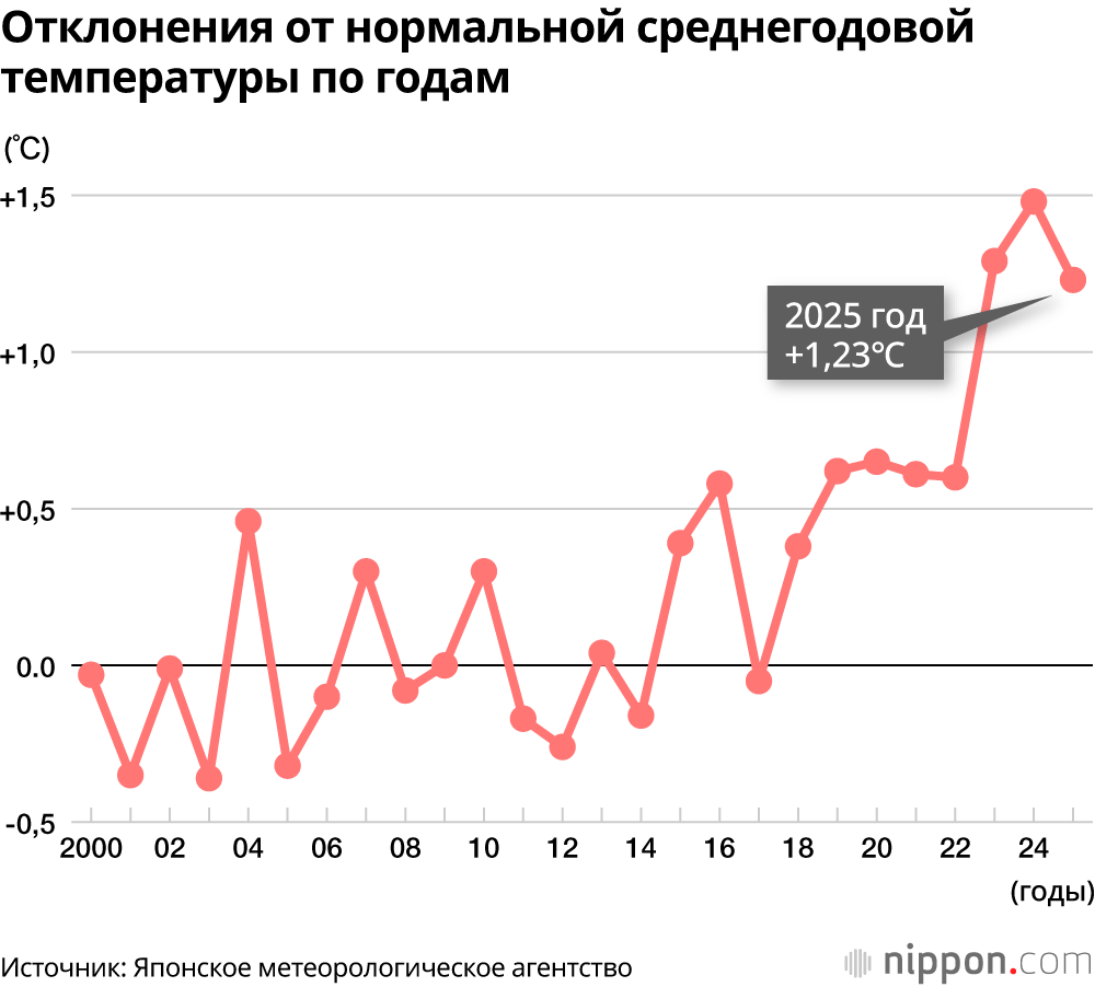Японское метеорологическое агентство объявило, что среднегодовая температура в Японии в 2025 году (предварительные данные) была на 1,25°C выше нормы, или среднего значения за 30 лет до 2020 года, достигая третьего по величине уровня с момента начала сбора такой статистики в 1898 году. Семь наблюдений самых высоких средних температур происходили за последние семь лет, с 2019 по 2025 год. Из них три самые высокие отклонения температуры от среднего показателя за всю историю наблюдений составили +1,48°C в 2024 году, +1,29°C в 2023 году и +1,25°C в 2025 году, что подтверждает прогрессирование глобального потепления.