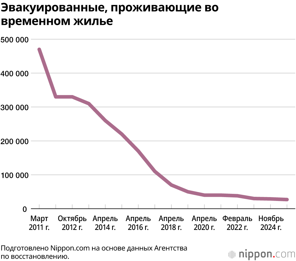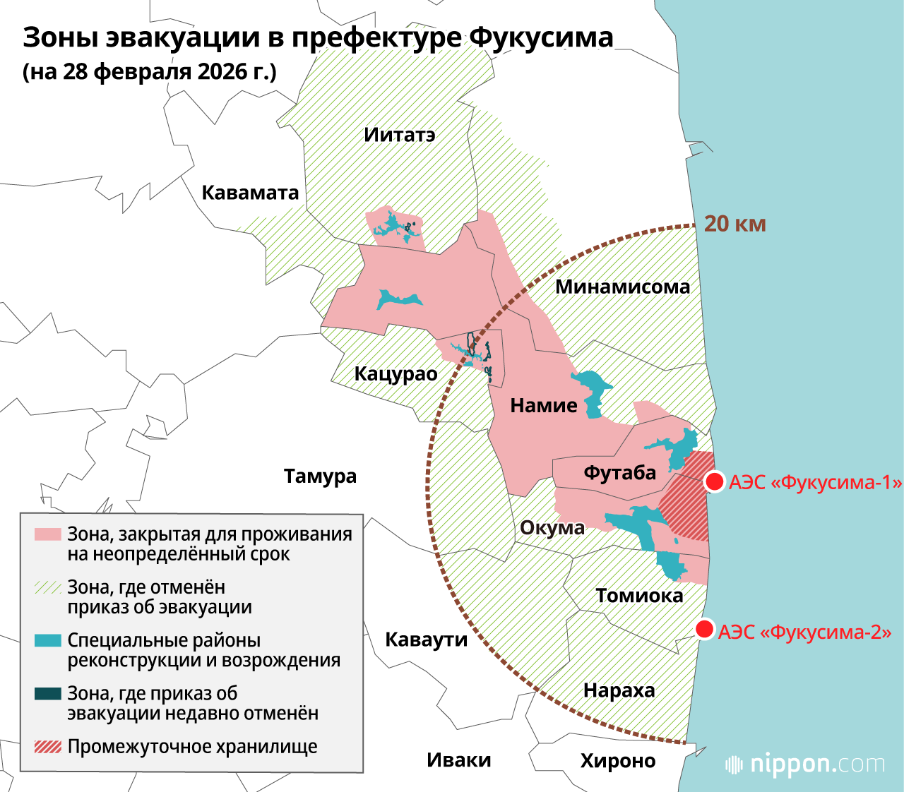 Работы по дезактивации в населённых пунктах вблизи АЭС «Фукусима-1» продолжаются. Тем не менее, по данным префектуральных властей Фукусимы, по состоянию на декабрь 2025 года около 309 квадратных километров территории в семи муниципалитетах остаются закрытыми для проживания.