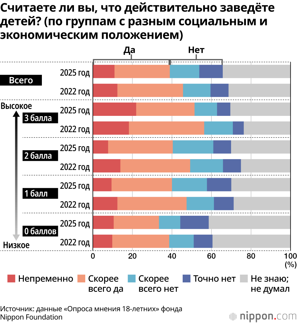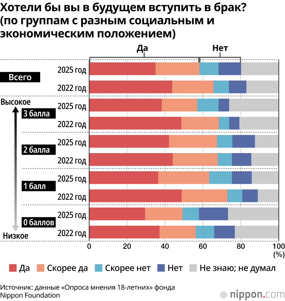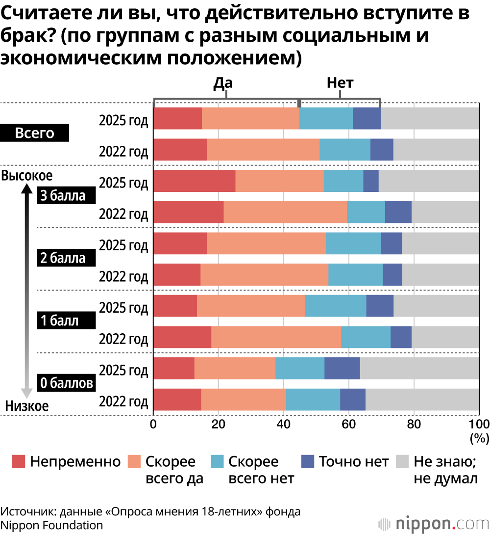 Процент респондентов, ответивших, что они хотели бы вступить в брак в будущем (сумма ответов «Да» и «Скорее да»), снизился на 7,4 пункта и составил 58,1%. При анализе респондентов с разделением на четыре группы от 0 до 3 баллов на основе экономического и социального положения их семьи с использованием простого метода (более высокие значения указывают на большее богатство), группа с 0 баллами показала намерение вступить в брак на уровне 49,2%, что ниже 50%, и значительно ниже, чем в других группах.
