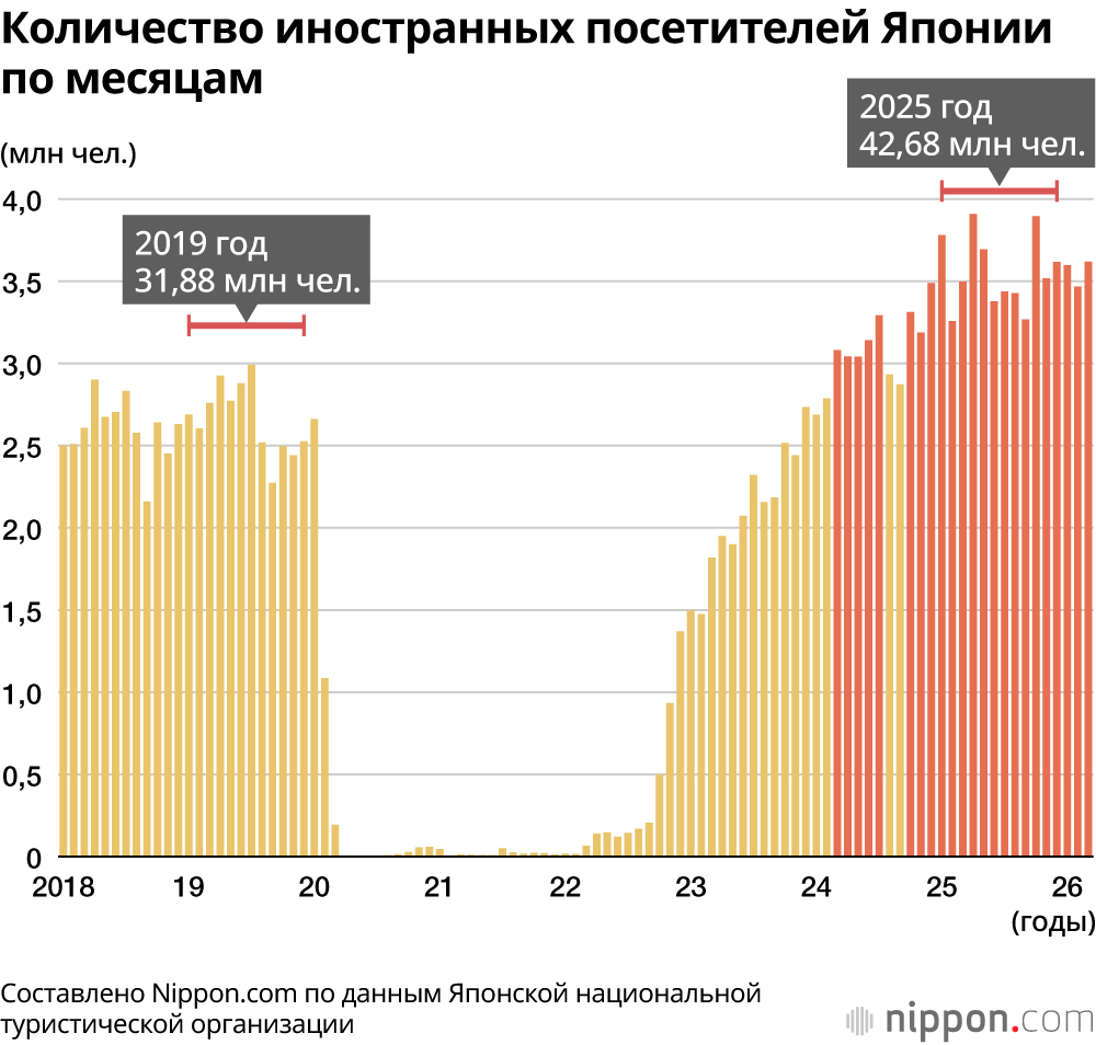 - Японская национальная туристическая организация: Количество иностранных посетителей Японии (оценочное значение по состоянию на март 2026 г.)