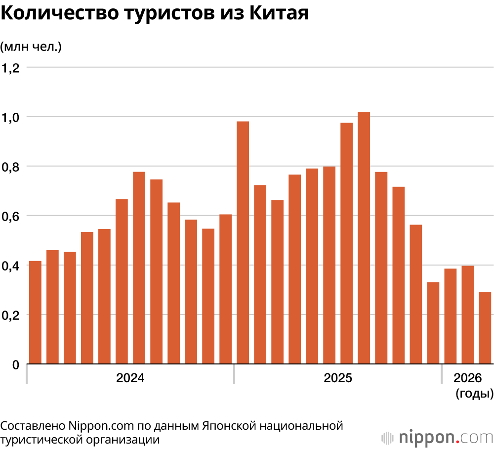 После высказываний премьер-министра Такаити Санаэ о чрезвычайной ситуации на Тайване китайское правительство призвало людей воздержаться от поездок в Японию, и количество туристов из Китая сократилось в марте на 55,9% до 291 600 человек, снижаясь четвёртый месяц подряд по сравнению с уровнем предыдущего года. Также наблюдается значительное снижение посетителей из стран Ближнего Востока, оно уменьшилось на 30,6% из-за последствий отмены и сокращения количества рейсов, вызванных ухудшением ситуации в регионе.