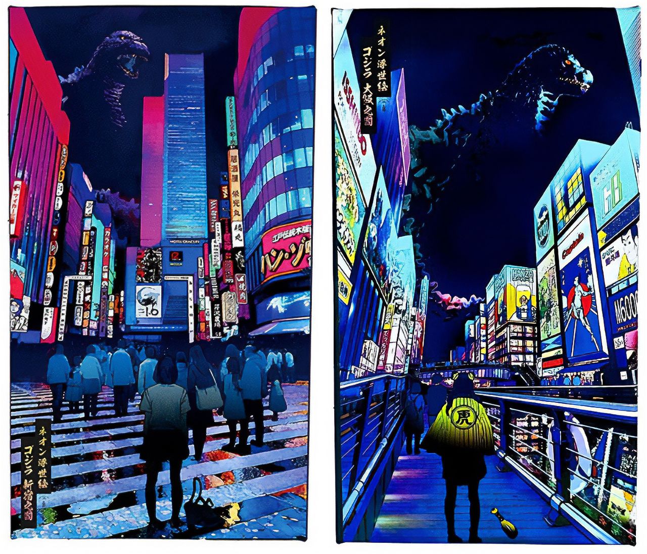 Ограниченная серия неоновых рисунков укиё-э на тканевой основе с изображением Годзиллы в Токио (слева) и Осаке (предоставлено «Хандзо»; TM, © Toho Co., Ltd.)