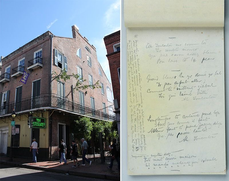 В Новом Орлеане Херн снимал комнаты в доме 516 по улице Бурбон (слева). Заметки Херна о журналистской деятельности в Новом Орлеане (© Мемориальный музей Лафкадио Херна)