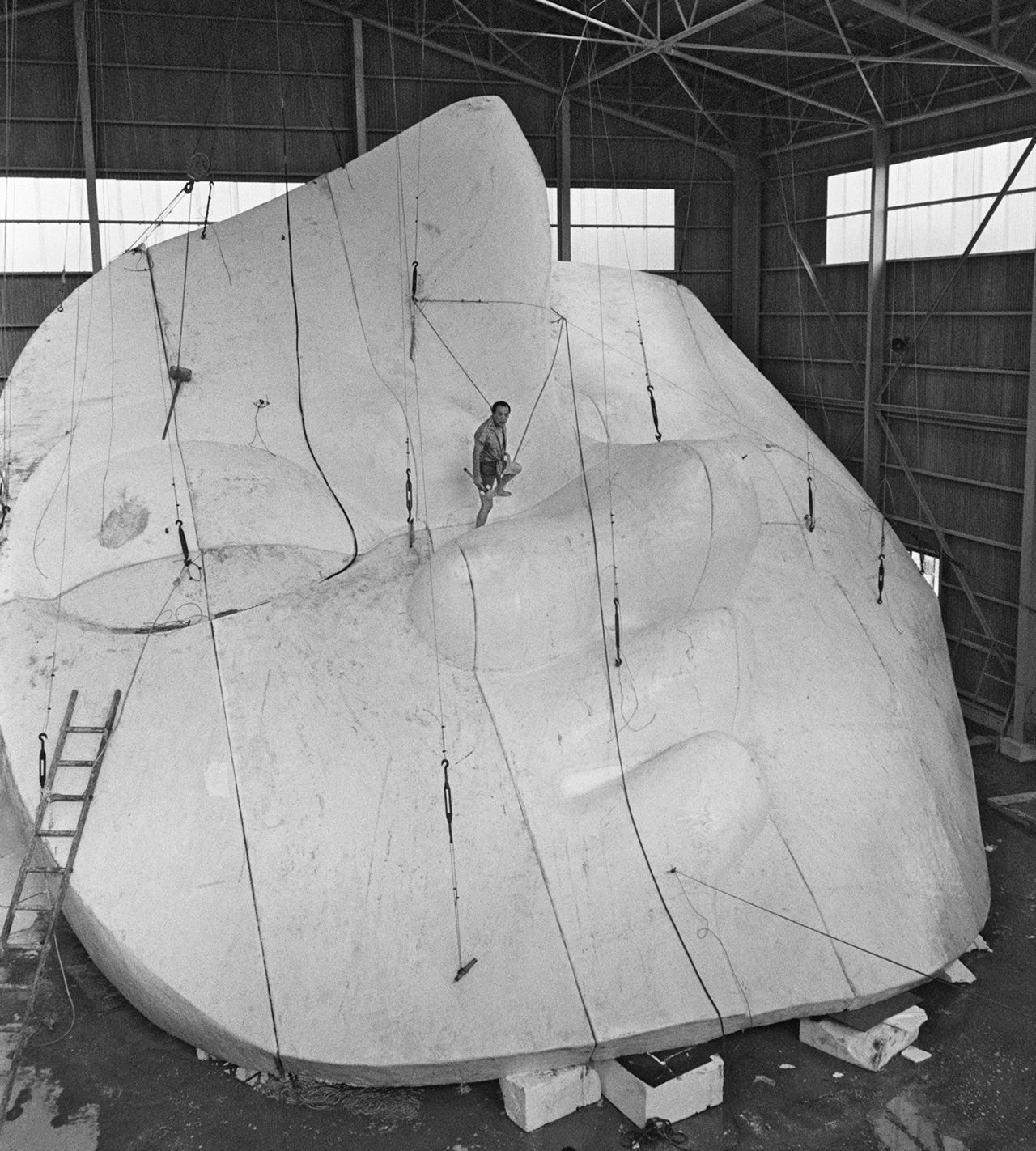 Окамото Таро (в центре) работает над гигантским Ликом Солнца, предназначенным для фасада башни (© Jiji)