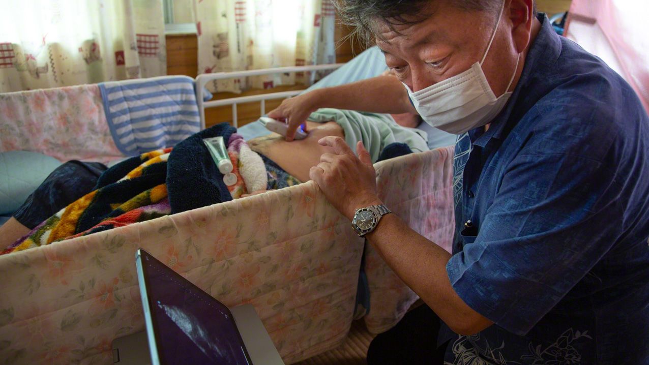 Ясукава осматривает пациента с помощью портативного ультразвукового аппарата (© Ониси Наруаки)