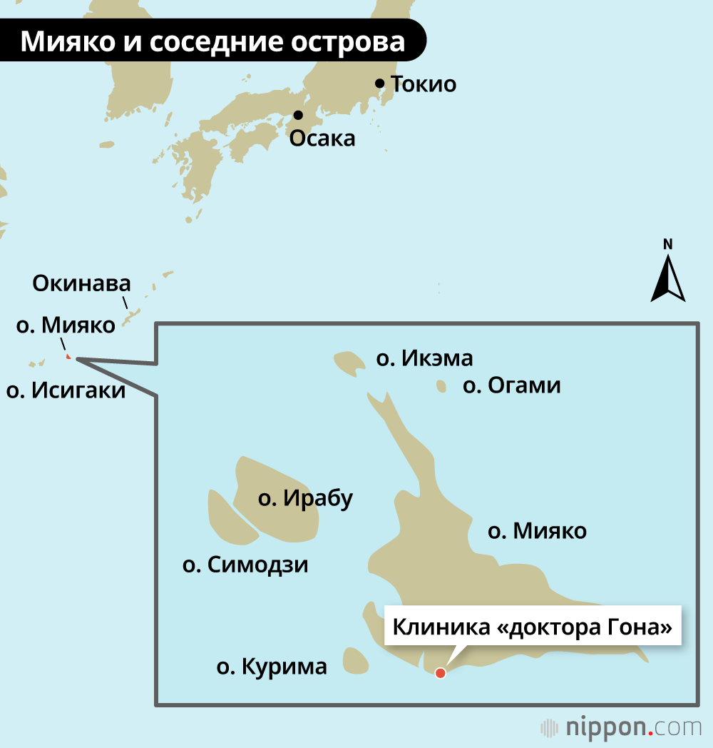 Штаб-квартира операций Ясукавы, его «Клиника доктора Гона», обслуживает Мияко и пять окружающих его островов. Четыре из них соединены с Мияко мостами (последним стал мост на остров Ирабу, открытый в 2015 году), и Огами остаётся единственным островом, доступным только по морю. Паромное сообщение часто приостанавливается из-за сильного волнения на море, но, несмотря на относительную труднодоступность острова, Ясукава полон решимости продолжать посещать его до тех пор, пока на нём остаются жители.
