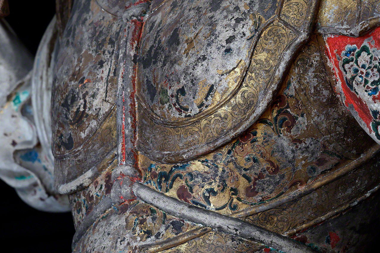 Фотограф Муда Томохиро рассказывает: «Когда я включил свет, чтобы фотографировать, меня поразило, насколько статуя сохранила свои яркие цвета. Киноварь и зелёная краска на левой руке особенно поражают яркостью – настолько, что я мог бы подумать, что они нанесены в годы Мэйдзи (1868-1912)».