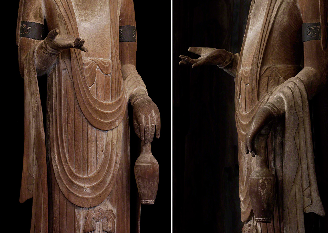 Бодхисаттва левой рукой непринуждённо держит кувшин, а правая рука приподнята ладонью вверх, она как будто скопирована со статуи Кудара Каннон в монастыре Хорюдзи, признанной национальным достоянием.