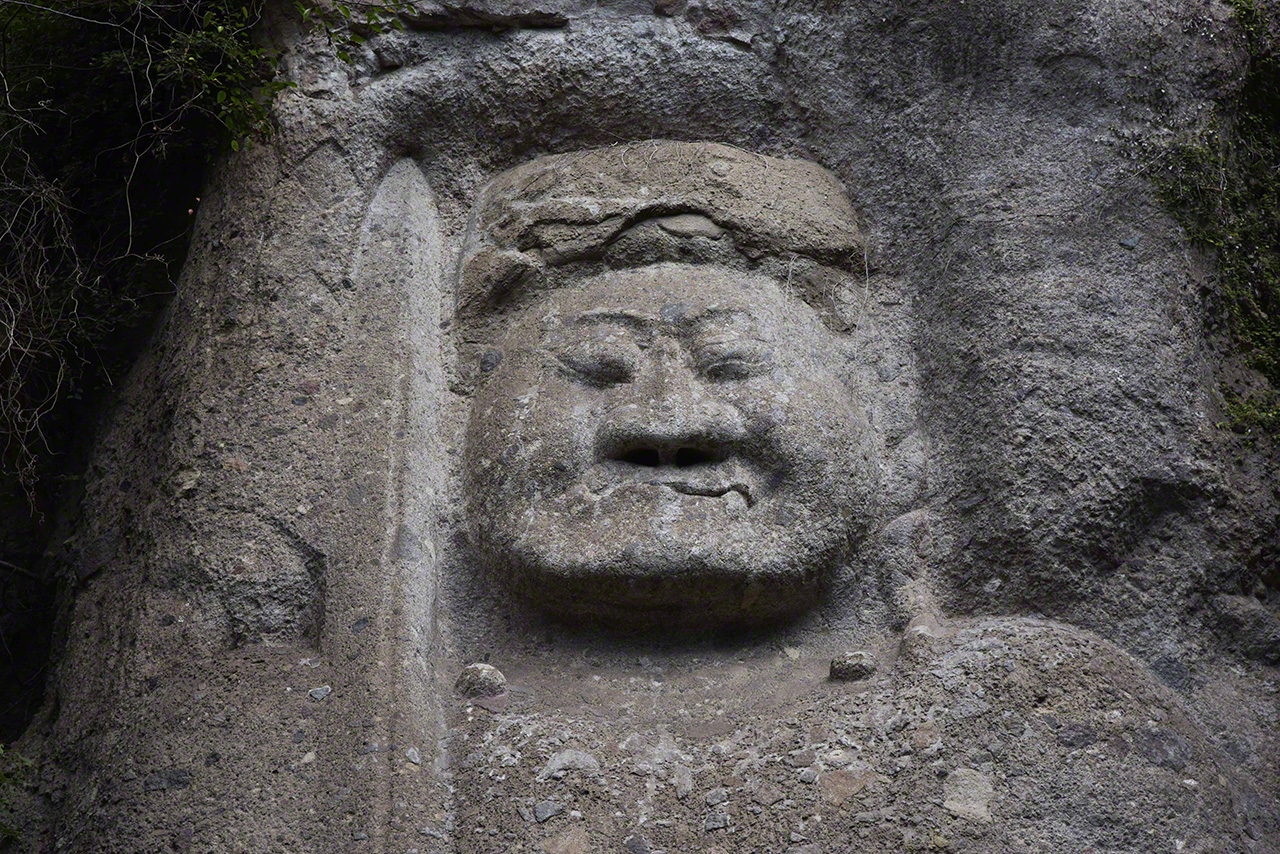 Фигура, держащая меч в правой руке и верёвку в левой, – Фудо мёо (Ачала). Обычно его изображают с гневным выражением лица, он направляет невежественных существ на путь Будды, однако у этого высеченного в скале Ачалы один глаз закрыт, изо рта торчат клыки, а на лице, похоже, сияет кроткая улыбка. Созданная в начале периода Камакура (1192-1333) восьмиметровая статуя является одной из самых больших скальных буддийских изображений (магаибуцу) в Японии.