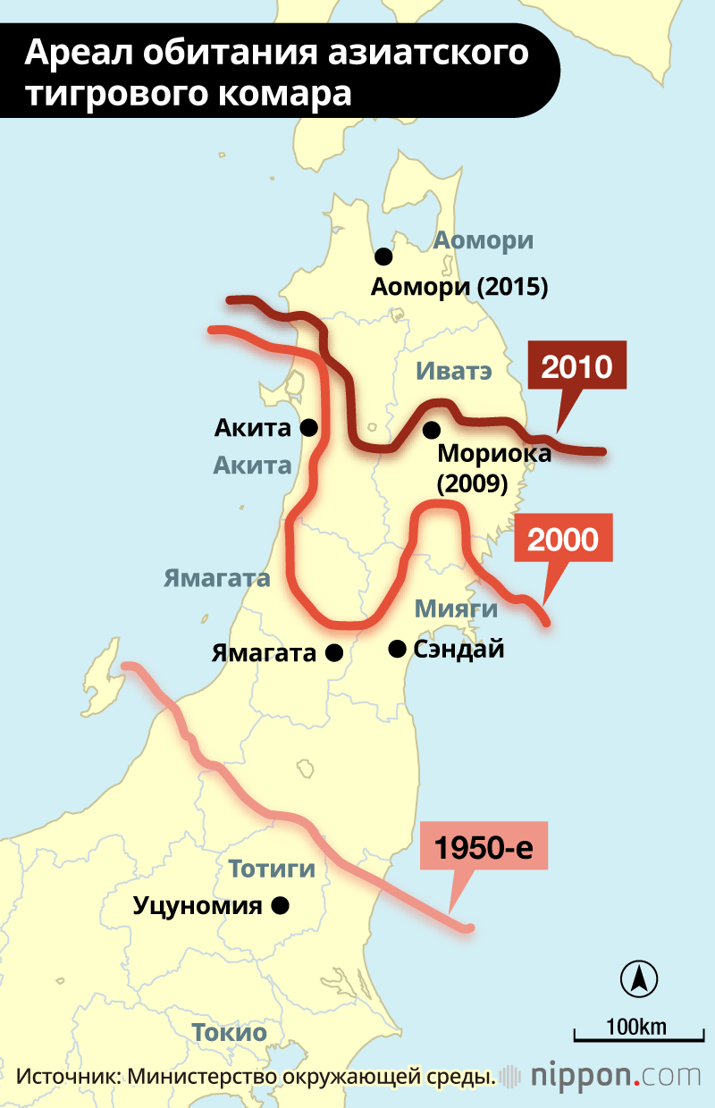 В 1950-х годах северная граница ареала обитания азиатского тигрового комара проходила по границам префектур Фукусима, Тотиги и Ибараки. Однако к 2010 году комары этого вида были замечены в префектурах Акита и Аомори. Хотя азиатских тигровых комаров на Хоккайдо пока не наблюдалось, в докладе Министерства окружающей среды говорится, что этот вид доберётся до самой северной префектуры к 2100 году.