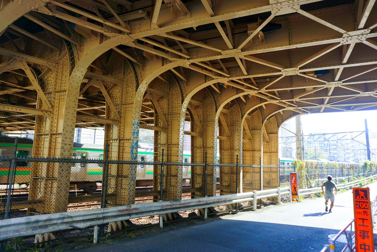 Удаляясь от высоток на юг вдоль линии Яманотэ, я попадаю в совершенно другой мир, мир старых обветшалых зданий, покрытых граффити и наклейками. Похоже, что это излюбленный маршрут немногих смельчаков, которые выходят на пробежку в этой части города, зажатой между многочисленными строительными площадками, ржавеющими железнодорожными эстакадами и поездами, грохочущими по другую сторону забора. Они проносятся мимо каждую минуту, иногда даже каждые 15-20 секунд.
