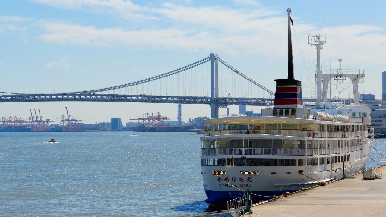 Фотография к заголовку: Вид с восточной стороны линии Яманотэ на пирс Такэсиба, Радужный мост и Токийский залив (© Pixta)