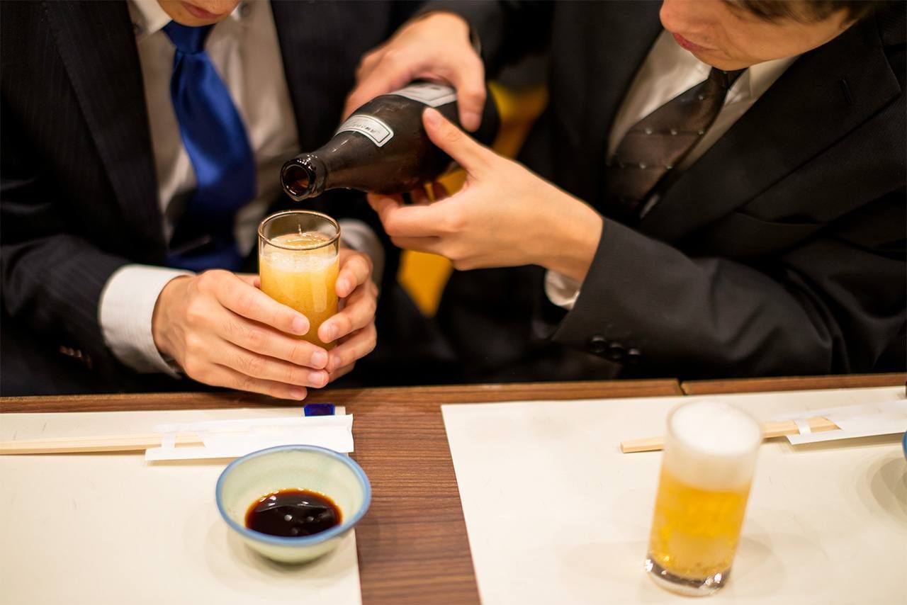 Многие японцы считают хорошим тоном, наливая пиво другому человеку, держать бутылку так, чтобы этикетка была обращена вверх. Во многих компаниях до сих пор сохраняется негласное правило: сотрудники более низкого ранга должны заботиться о том, чтобы наполнять бокалы начальству и подавать еду (© Pixta)