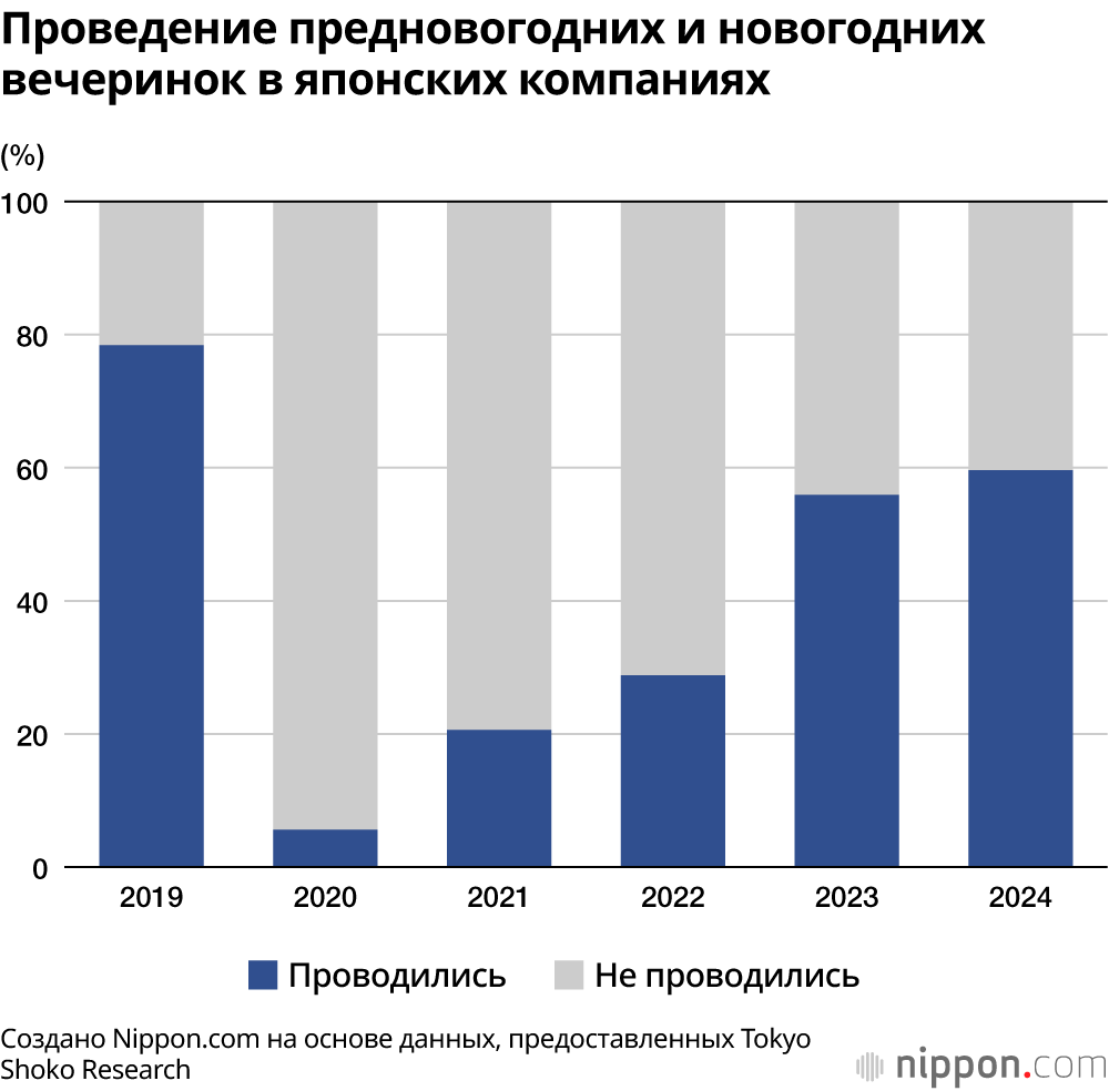 Однако эта корпоративная традиция стремительно меняется. Согласно исследованию Tokyo Shōkō Research, проведённому в 2024 году, лишь 59,6% фирм устраивали новогодние или предновогодние вечеринки – почти на 20% меньше, чем в 2019-м, до начала пандемии COVID-19. Среди причин – падение интереса, а также всё более открытое нежелание сотрудников участвовать в застольях. В результате культура корпоративных вечеринок так и не восстановилась полностью даже после отмены всех карантинных ограничений.