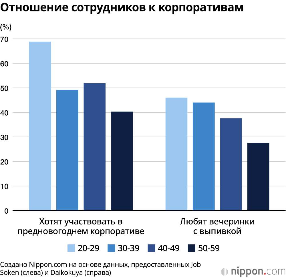 Однако опрос Job Sōken, проведённый в 2024 году, показал неожиданную тенденцию: именно старшие сотрудники чаще выказывают равнодушие к номикай. Среди работников в возрасте от 20 до 30 лет 68,8% заявили, что хотели бы посетить новогоднюю вечеринку, тогда как в группе сорокалетних этот показатель составил 51,9%, а среди пятидесятилетних – лишь 40,3%. Похожие результаты дал и опрос Daikokuya в 2023 году: 46% респондентов в возрасте от 20 до 30 лет и 44% в возрасте от 30 до 40 лет признались, что им нравятся рабочие вечеринки с алкоголем. Для сравнения — среди сотрудников от 40 до 50 и от 50 до 60 лет позитивно высказались о вечеринках с алкоголем соответственно 37,6% и 27,6%.