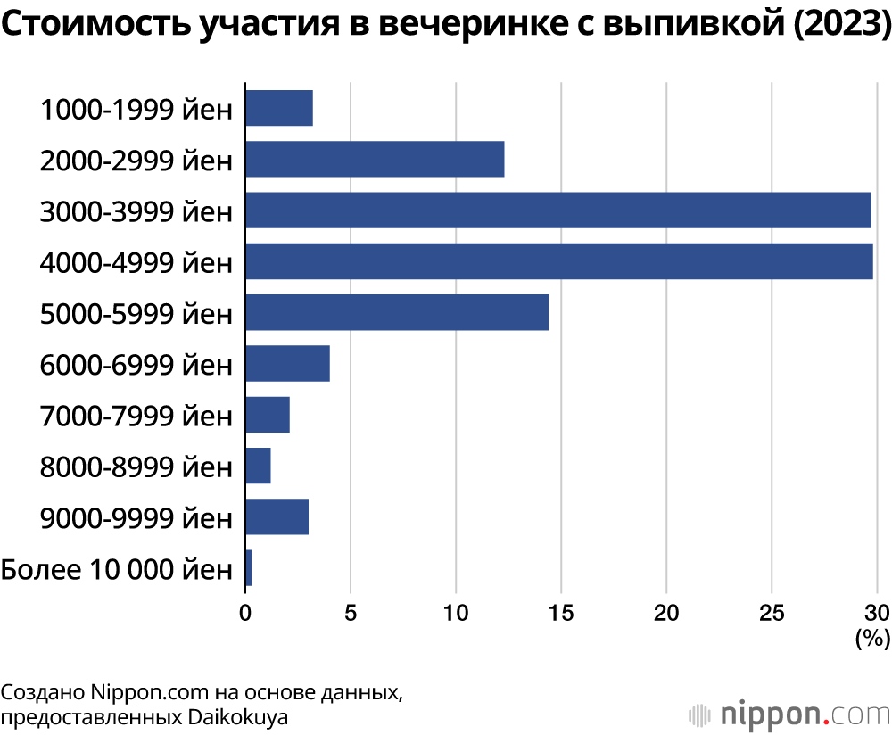 По данным Национального налогового агентства Японии, среднегодовое потребление алкоголя на душу населения в 2022 финансовом году составило 75,4 литра – на 25% меньше, чем тридцать лет назад. В целом молодое поколение пьёт заметно меньше, и поэтому считается, что именно молодёжь всё чаще избегает корпоративных застолий.