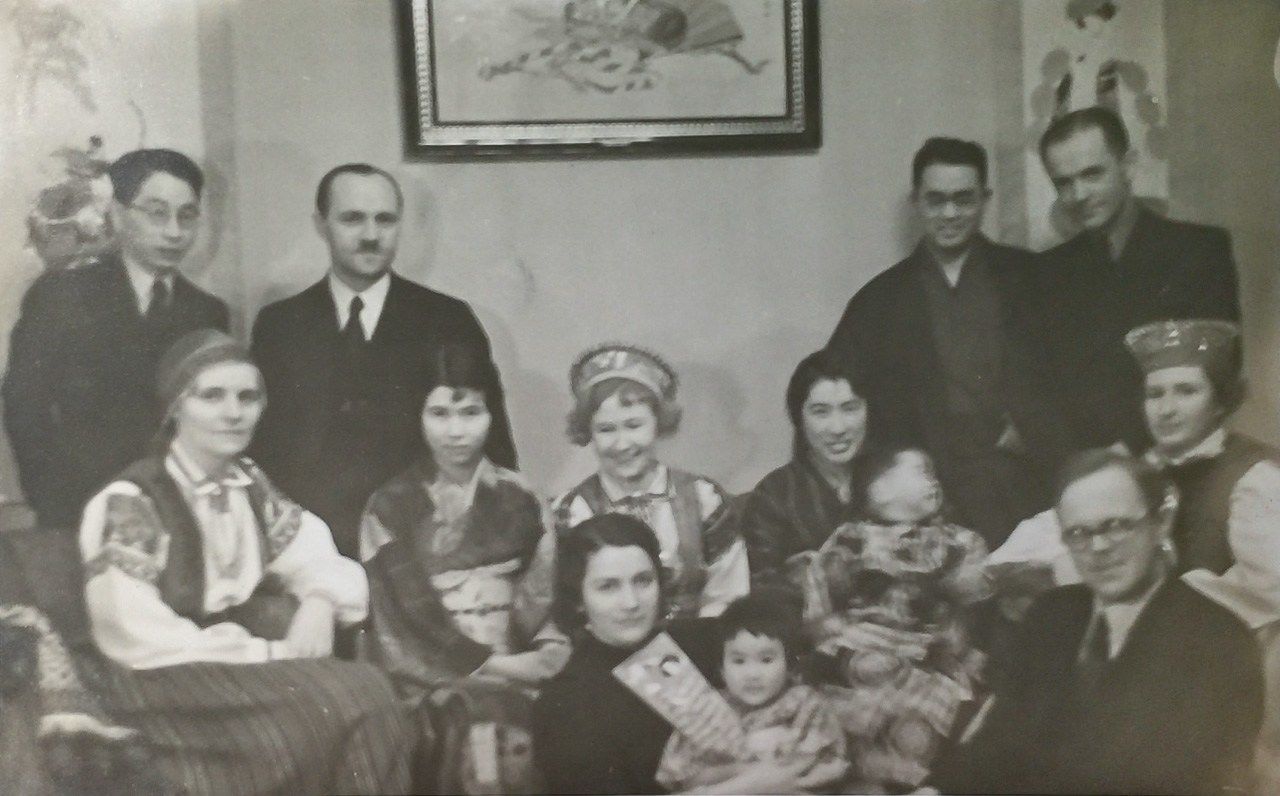 Онодэра Макото (второй справа в заднем ряду) и Юрико (вторая справа в среднем ряду) вместе с персоналом в помещении резиденции военного атташе в Риге (снимок предоставлен семьей Онодэра)