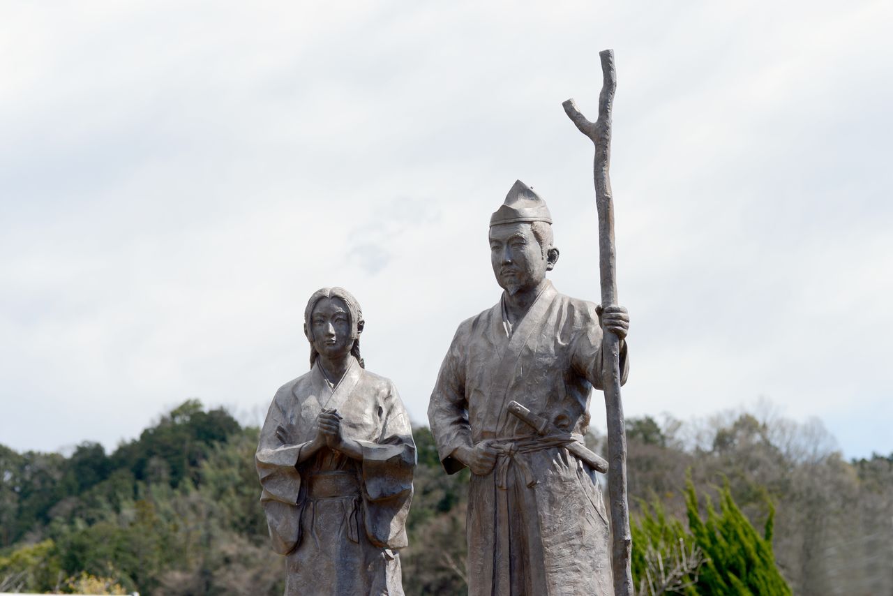 Бронзовая парная статуя Ёритомо и Масако в парке Хиругакодзима в городе Идзунокуни, преф. Сидзуока. Здесь они выглядят спокойными, но на самом деле Масако не прощала ему его похождений (PIXTA)