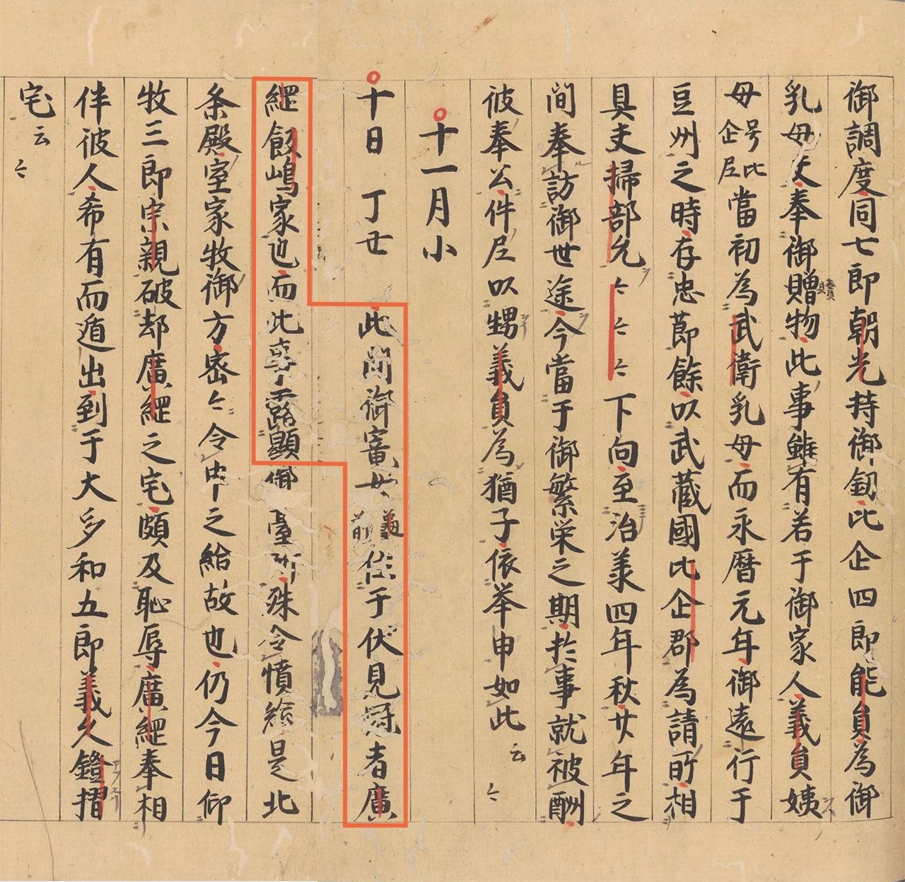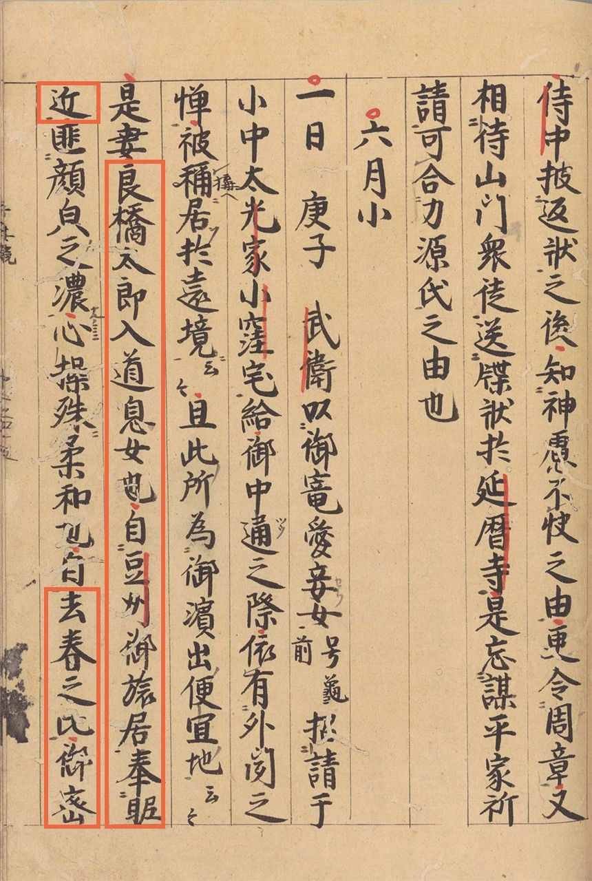 «Зерцало Восточных земель» (Адзума кагами), запись за 10 день 11 луны 1 года Дзюэй, где сказано, что Маки тайно сообщила Масако о Камэ-но маэ, а Маки (Сабуро) Мунэтика разрушил её жилище (собрание Национального архива Японии)